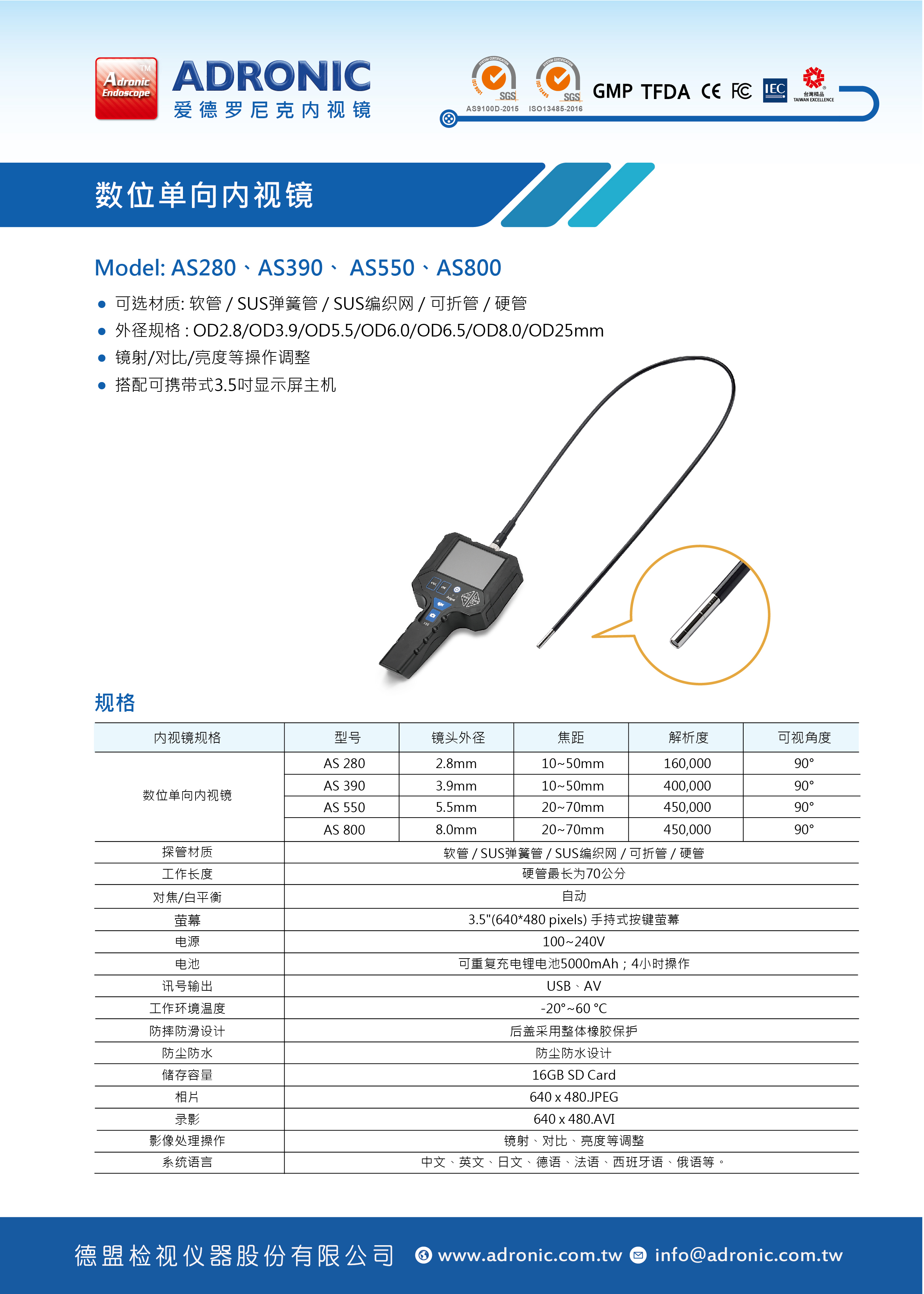 | 单向类比式内视镜 | AS 280 | 2.8mm | 10~50mm | 160,000 | 90° |
