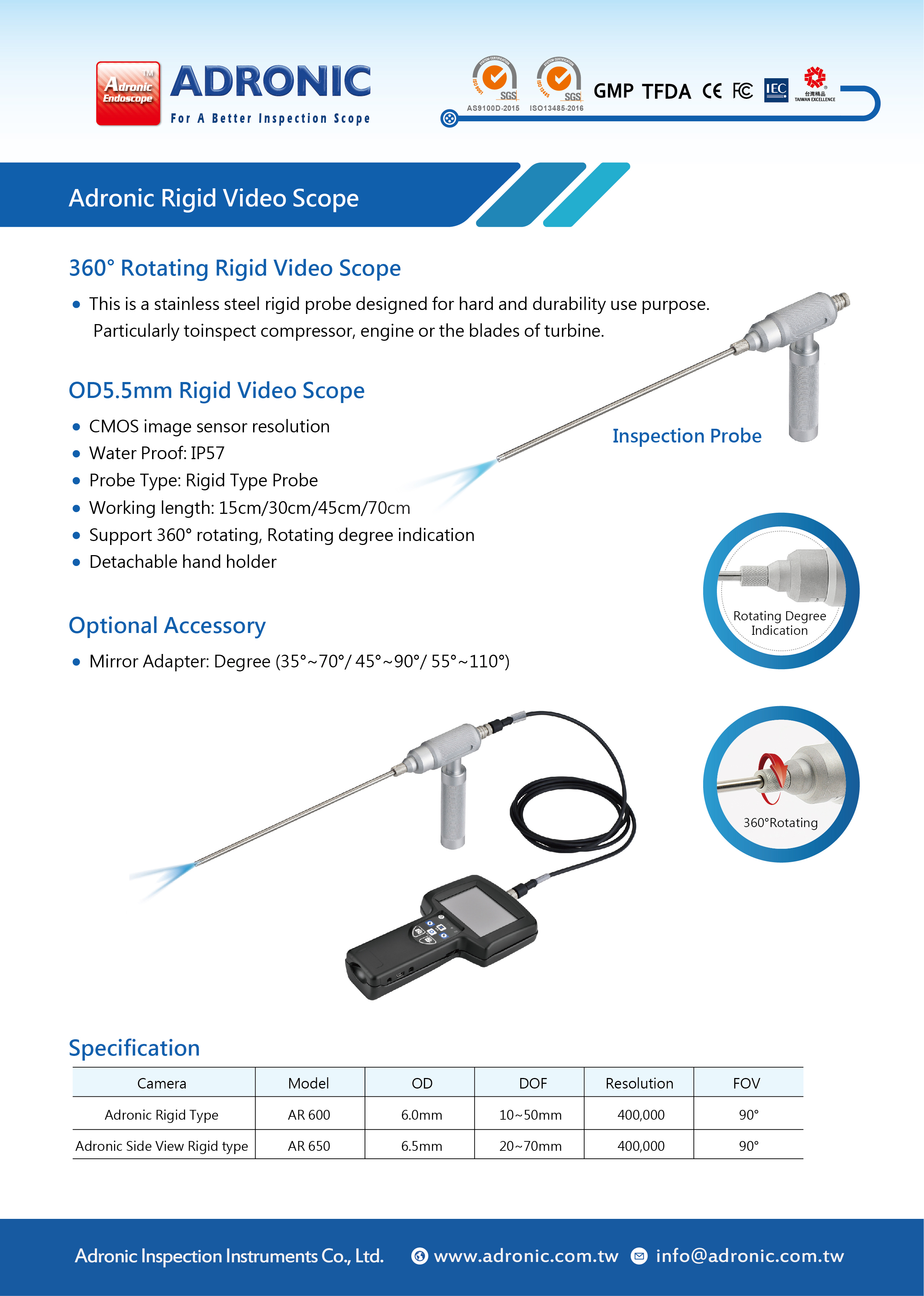 Our ADRONIC rigid type probe enables to support 360° rotating, it enables to check surroundings inside the restricted area. Our 360 degree rotation controller button is featured with degree guide line, user is able to know the rotated degree of lens.