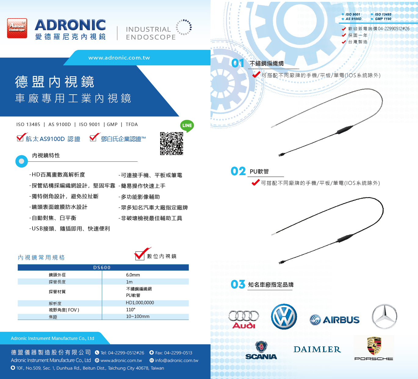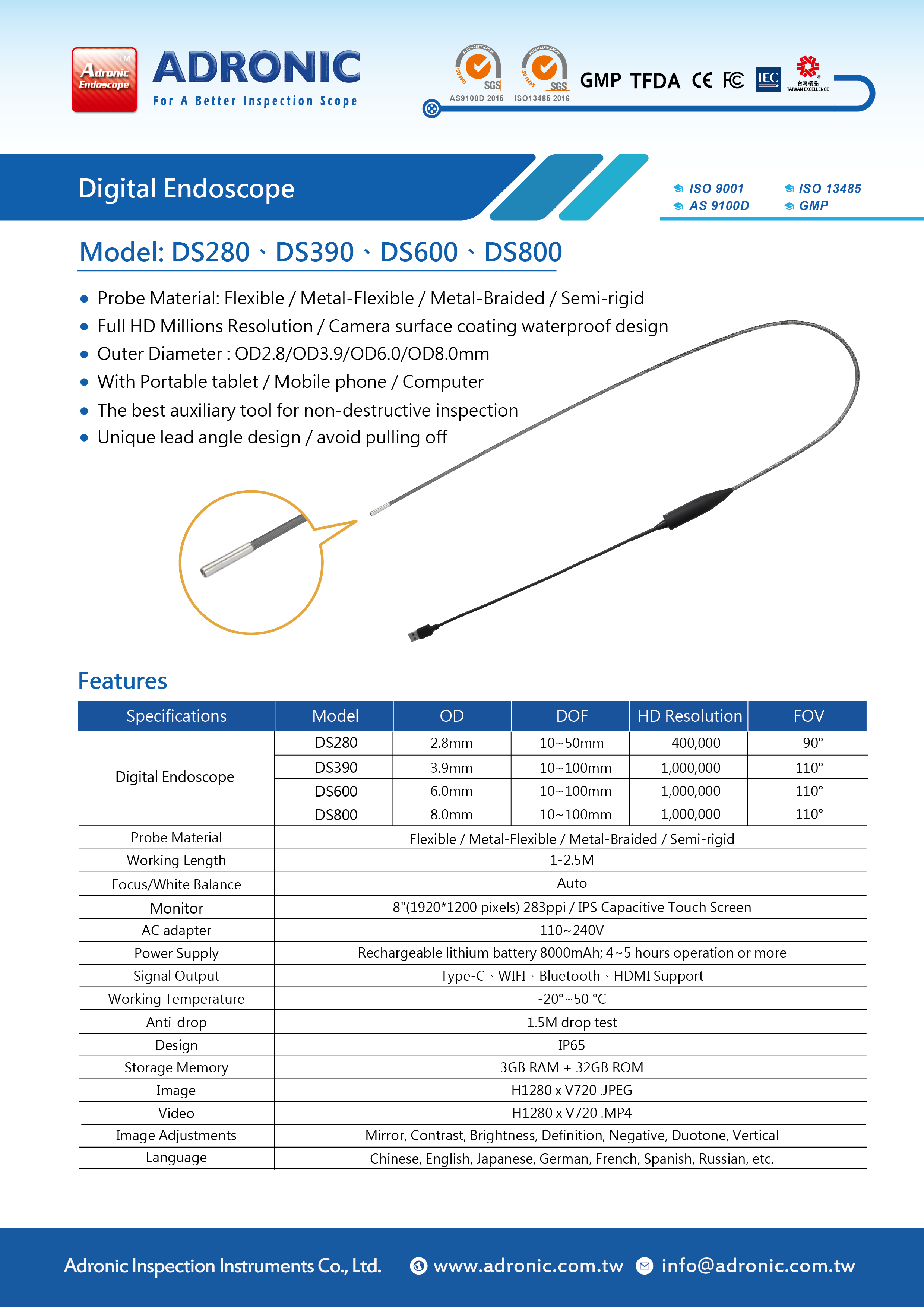 | Digital Endoscope | DS 390 | 3.9mm | 10~50mm | 400,000 | 90° |