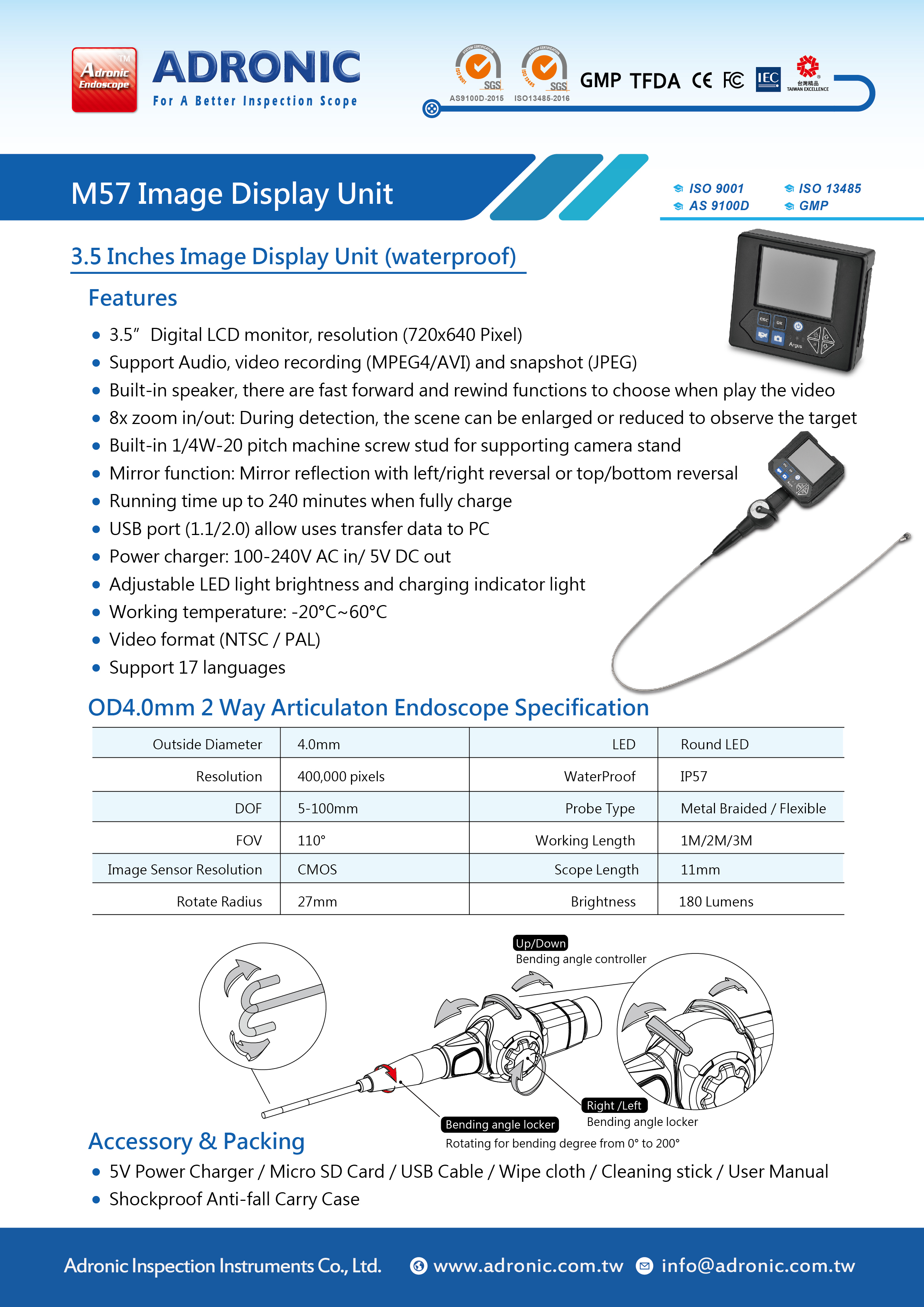M57 endoscope system is mainly used for inspection, repairing and maintenance. Within 3.5”digital LCD monitor, this unit could connect The screen is clear and stable, also could manually adjust the image size and illumination. M57 enable to support Snapshot, Audio and Video recording to enhance the detection performance.