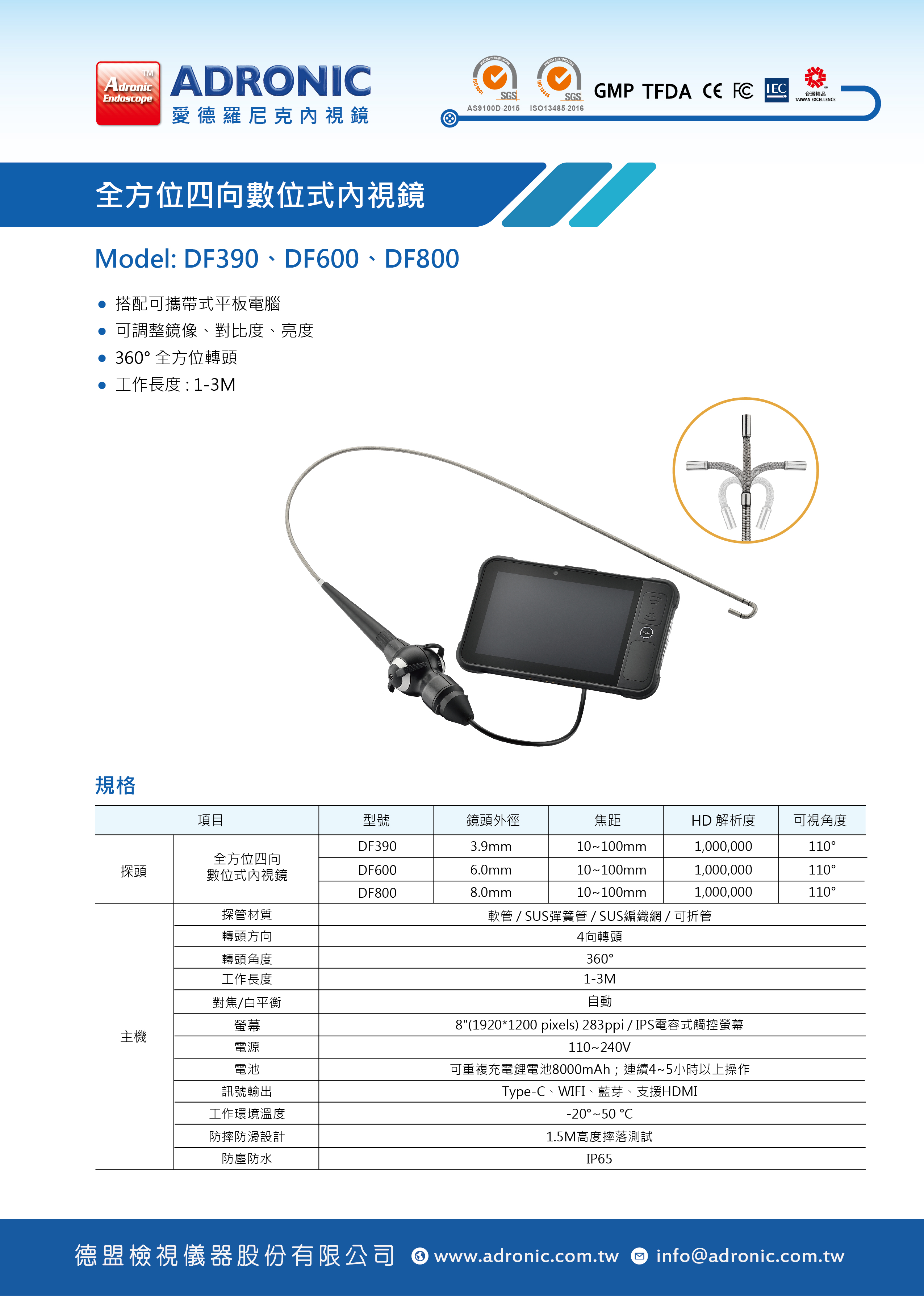| 探頭 | 全方位四向數位式內視鏡 | DF390 | 3.9mm | 10~100mm | 1,000,000 | 110° |
