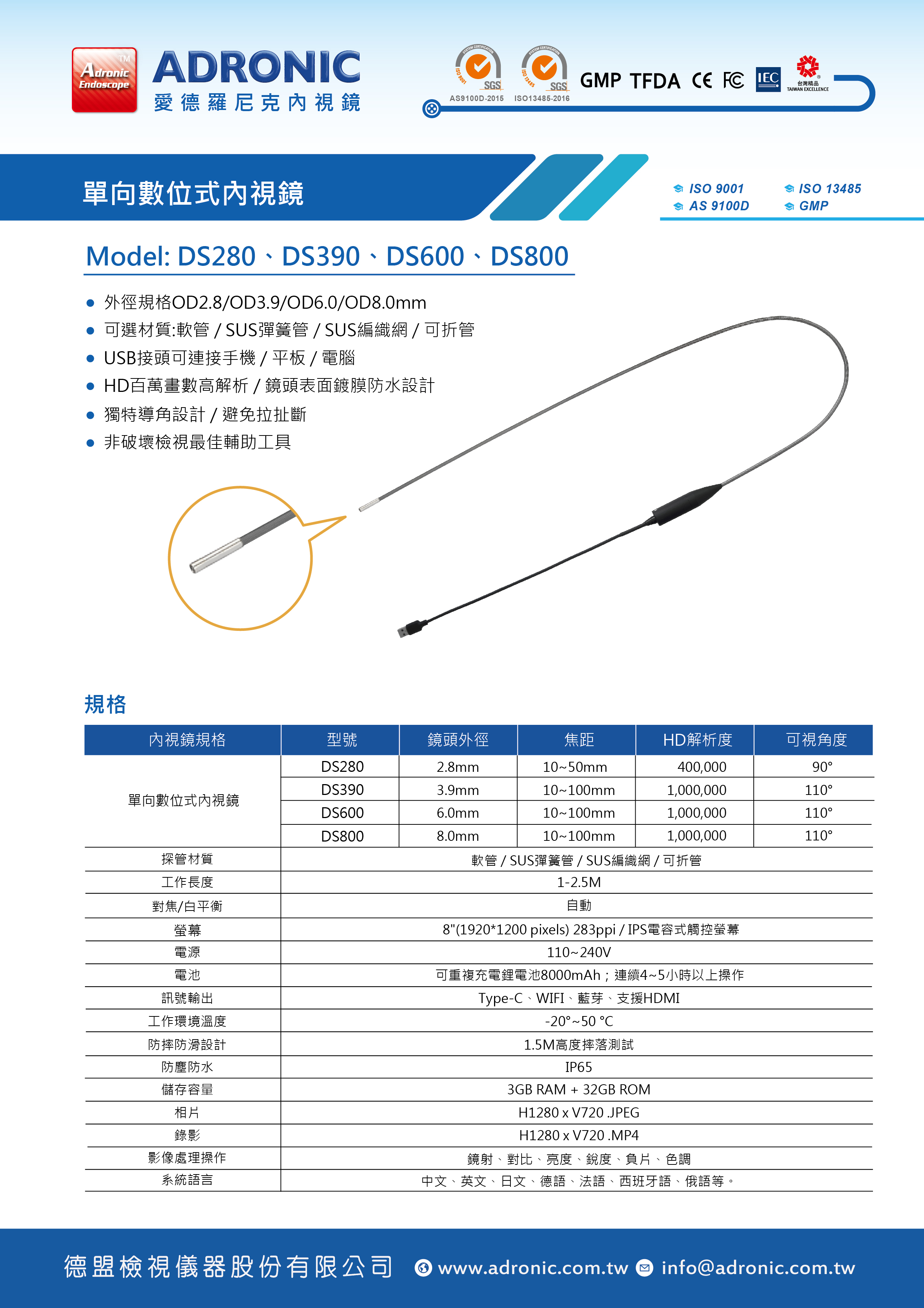 | 單向數位式內視鏡 | DS 280 | 2.8mm | 10~50mm | 400,000 | 90° |